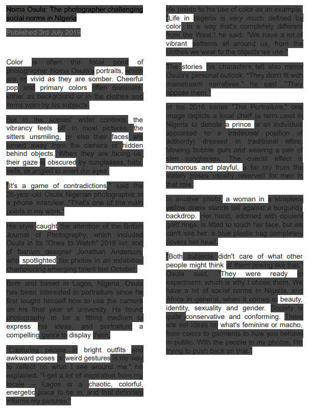 Found poems take existing texts and refashion them, reorder them, and present them as poems. The literary equivalent of a collage, found poetry is often made from newspaper articles, street signs, graffiti, speeches, letters, or even other poems. (poets.org)